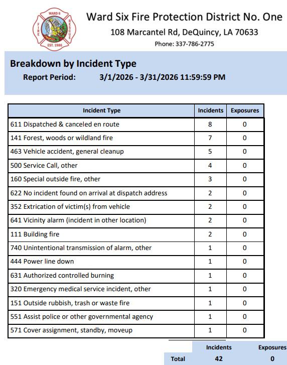 Ward 6 Firefighters responded to 42 Emergency Calls for service during the month of March. The firefighters continue to work together with Pride, Teamwork, and Excellence as they provide the community with professional emergency services.